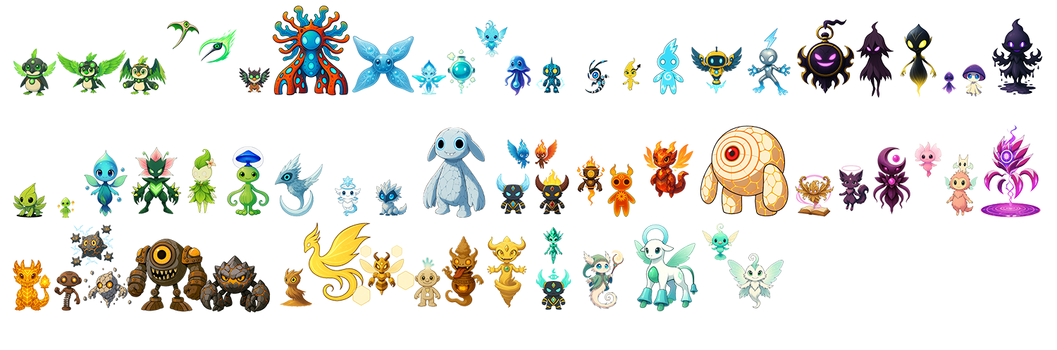 Perhaps the most crucial addition to the post-senior project development, the Golgems serve as spiritual mentors rather than traditional companion creatures. Unlike eLumis, they transcend domain boundaries, guiding chosen summoners toward critical decision points in the world's fate. Their design balances ancient mysticism with elemental clarity with each one immediately recognizable as both mysterious and connected to its domain's core identity.